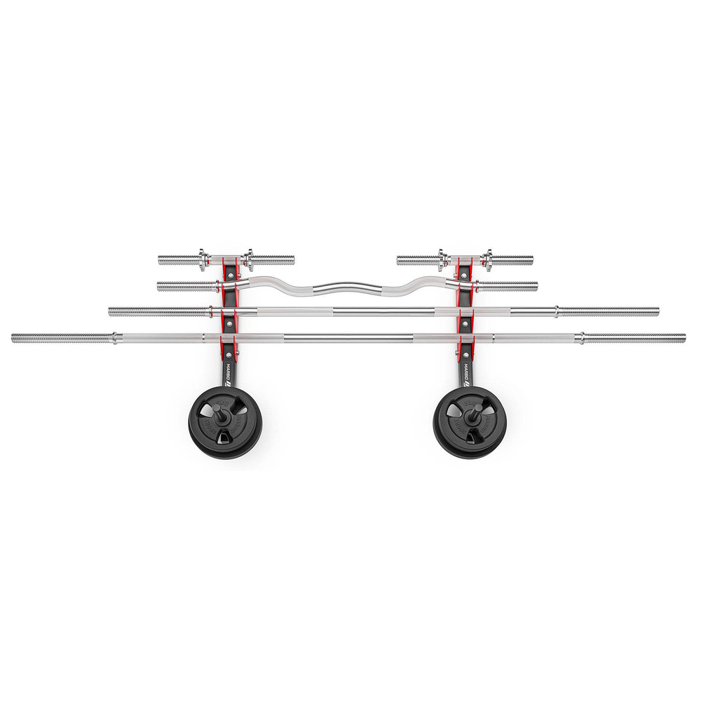 Wszystko w jednym miejscu za sprawą uchwytu MH-S208. Umieścisz na nim nawet 4 gryfy olimpijskie lub aż 8 gryfów krótkich, które okażą się dla Ciebie niezbędne podczas ćwiczeń.